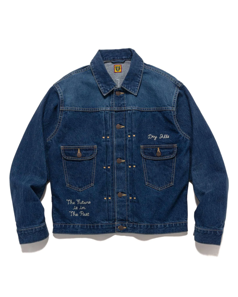 The indigo denim used in the jacket’s construction is of high quality, offering a deep, saturated color that ages beautifully over time. The jacket features a button-front closure, chest pockets with flaps, and side pockets that enhance its practicality without compromising on style. The stitching is robust, ensuring that the jacket can withstand the rigors of daily wear.
