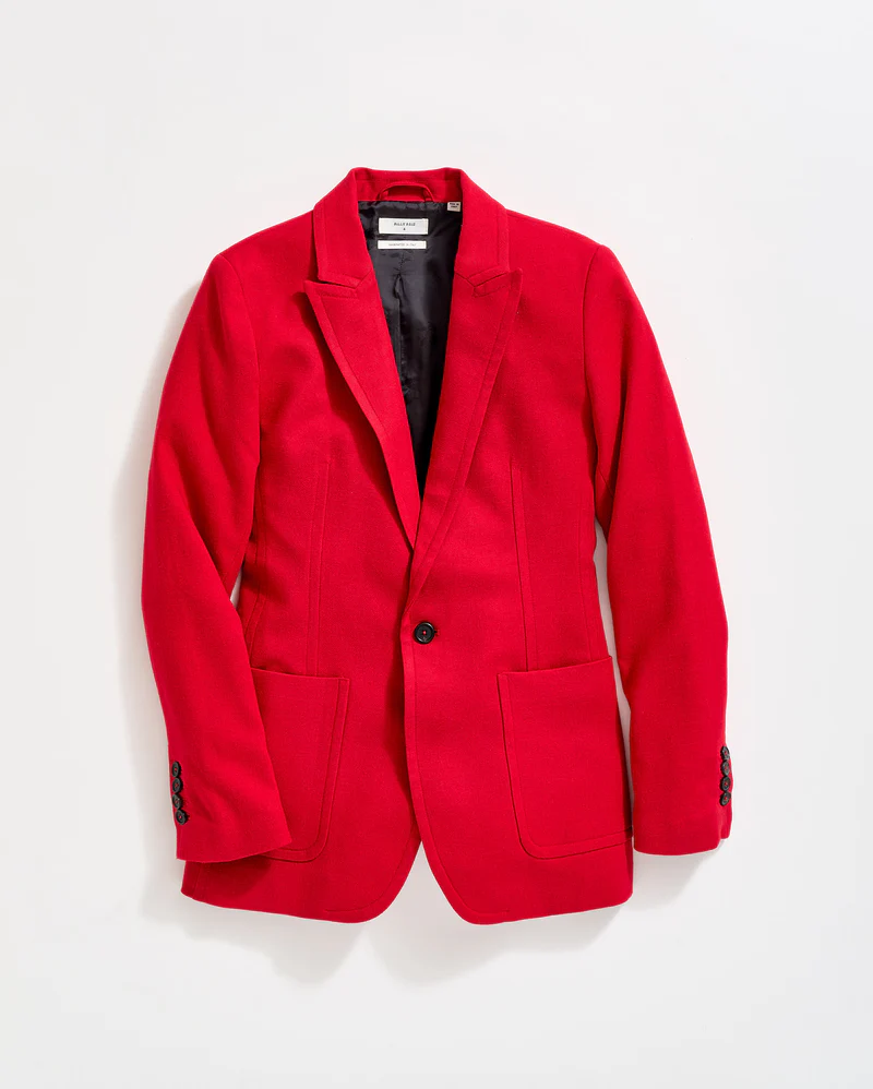 The Wool Peak Lapel One-Button Blazer is designed to offer a tailored fit that flatters a range of body types. Its cut is fitted enough to create a defined silhouette but leaves ample room for movement and layering over dress shirts or light sweaters.